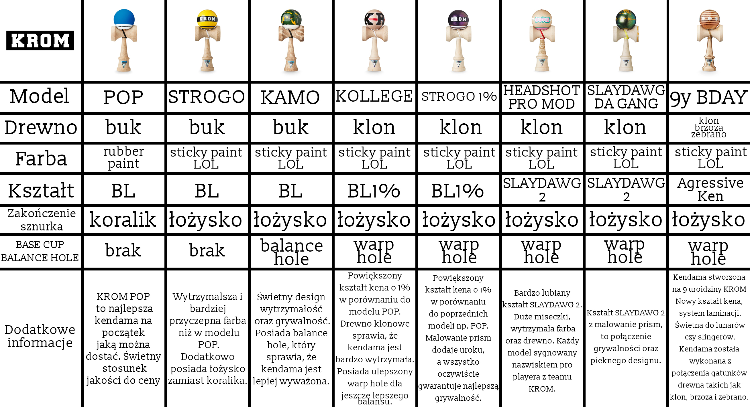 KROM Kendama este unul dintre cei mai importanți producători de kendam la nivel mondial. Marca oferă o gamă largă de modele, de la cele pentru începători până la cele jucate de jucătorii PRO. Dacă sunteți la început în kendama, este posibil să nu știți la ce să vă uitați, care sunt diferențele dintre diferitele modele sau care model va fi cea mai bună alegere. Tabelul următor prezintă diferențele dintre diferitele modele KROM.Kendamy diferă, printre altele, în ceea ce privește tipul de lemn - modelele mai scumpe au adesea lemn de arțar mai durabil în loc de fag. Pictura barajele variază, de asemenea. În cele mai ieftine POP-uri veți găsi vopsea de cauciuc obișnuită, în timp ce în altele veți găsi de obicei vopsea foarte lipicioasă și lipicioasă LOL.