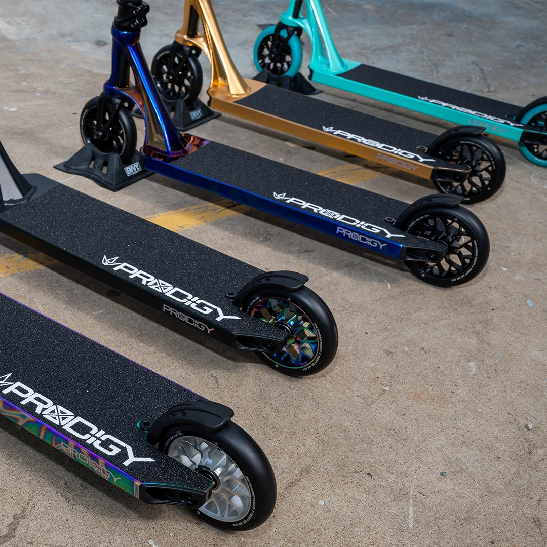 A zecea serie din linia Prodigy, care se bazează pe nouă generații de scutere Blint și este rezultatul a 12 ani de experiență în colectarea. Este o combinație de produse clasice Prodigy, cum ar fi ghidonul ușor Reaper V2, mânerele moi și durabile și furca cu sistem de compresie IHC. Restul componentelor au fost supuse unei renovări majore. Platforma are un profil mai coborât, laturi mai late și o concavitate receptivă. Îmbunătățirile aduse punții au avut ca scop reducerea greutății acesteia la 3,26 kg, menținând în același timp durabilitatea ridicată. Prodigy X este inovație, performanță ridicată combinate cu clasicele de la Blunt Scooters. Acest model este disponibil în două dimensiuni 86.5cm și 90cm.