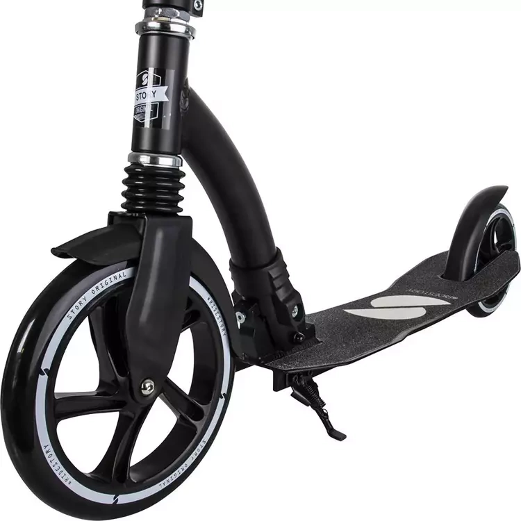 Story Retro Ride este fabricat din materiale de înaltă calitate. Datorită roții sale din față foarte mari, se rostogolește aproape perfect peste pietricele sau alte denivelări de pe drum. Materialul PU superb al roților, precum și talia lată și suspensia frontală, asigură o deplasare moale și confortabilă pe străzile orașului. Acest lucru vă va duce de la punctul A la punctul B ușor și rapid. Dacă mergeți prea repede, puteți folosi întotdeauna frâna elastică situată deasupra roții din spate.