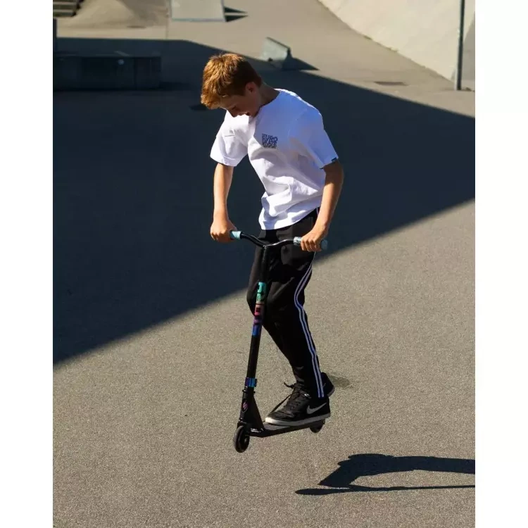 Greutatea redusă nu reduce durabilitatea într-o măsură relevantă pentru copii și călăreții ușori. Decupajul furcii, care este vizibil prin tubul capului, conferă scuterului un aspect modern. Roțile din nailon și sistemul de compresie "Threaded" fac scuterul accesibil și ideal pentru începători!