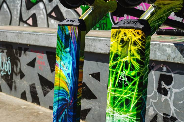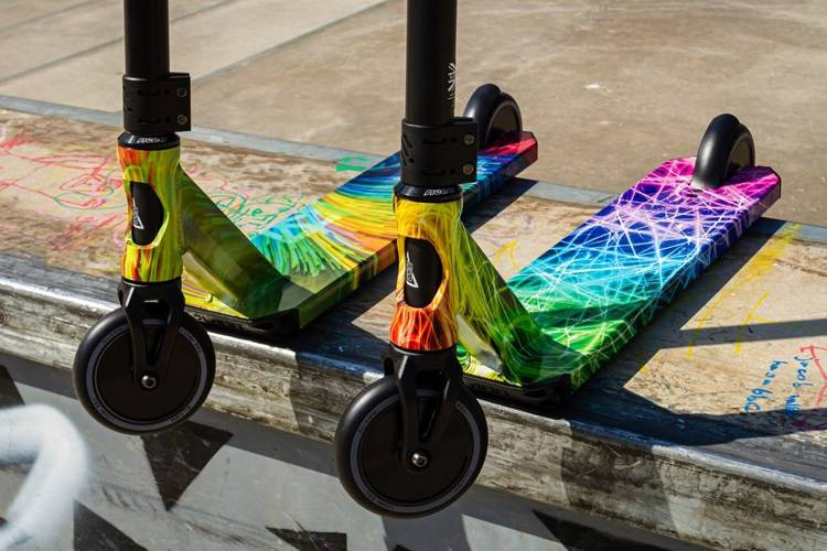 Strobe V4 are roți ușoare cu miez gol, clemă dublă CNC și furcă din aluminiu forjat. Acestea creează o siluetă întunecată care contrastează estetic cu învelișul platformei în culori energice. Ghidonul Riser T-Bar din oțel funcționează cu o punte subțire și ușoară, care este ușor de ridicat de la sol și de manipulat în aer pentru trucuri aeriene elegante. O platformă cu un dropout decupat, oferind o greutate și mai mică și capacitatea de a monta peguri pentru a adăuga mai multă zonă de punte la scuter, utilă pentru grinds.