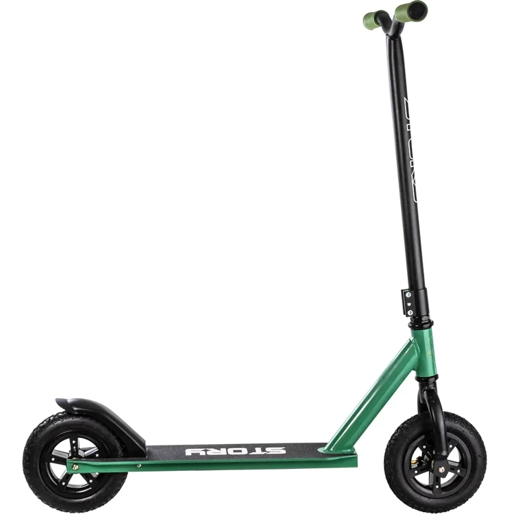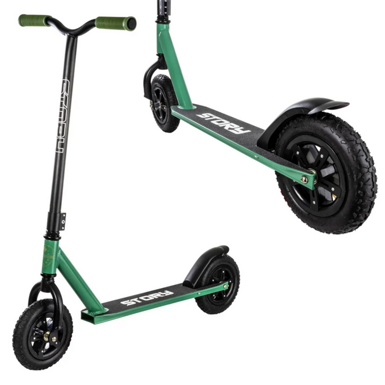 Story All Terrains Dirt este construit în jurul unei punți puternice din aluminiu. Este proiectat să fie lung, dar relativ îngust pentru a reduce greutatea. Ghidonul este de la un scuter de performanță - din acest motiv este lat și nu este reglabil pe înălțime. Avantajul de a nu fi reglabil este că volanul este mai robust, fără părți mobile. Mânerele de pe ghidon sunt moi și confortabile, nu veți simți nicio alunecare a mâinii pe ele în timpul călătoriei!