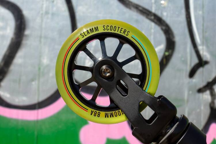 Roțile Classic V9 cu miez cu raze din aluminiu și uretan sunt foarte stabile în butuci și foarte receptive pentru a da și menține impulsul datorită rulmenților ABEC9 netezi. De la aceste roți, combinate cu greutatea redusă a scuterului, este foarte ușor să ieșiți cu racheta la măcinări elegante și să aterizați cu liniște, știind că sistemul scuterului este proiectat pentru suprasarcini de performanță. Pe lângă faptul că este construit foarte solid, Classic este, de asemenea, plăcut la vedere, datorită combinației de negru cu accente colorate pe clema grifonului și pe roți. Aveți încredere în calitatea Slamm și simțiți cât de ușor pot ieși rotirile de bară și railgrinds cu Classic V9!