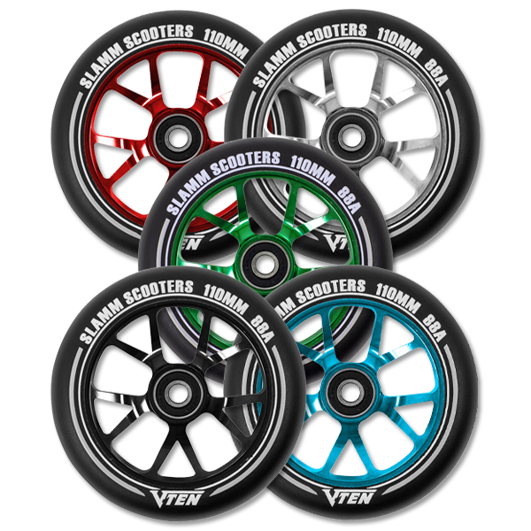 Roți furnizate de Slamm, pentru echipamente performante pentru scutere, compatibile cu majoritatea scuterelor de pe piață. Diametrul standard al roților le oferă o mare versatilitate în ceea ce privește viteza, durabilitatea, greutatea, prețul și stilul. V-ten sunt fabricate folosind o metodă CNC modernă, care adaugă și mai multă stabilitate și netezime rotației în rulmenți.