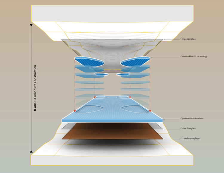 Deck Loaded Icarus este o construcție premium la cel mai înalt nivel, care pune această placă printre cele mai bune din lumea longboarding. Pentru a optimiza flexibilitatea plăcii pentru cei care doresc să profite la maximum de experiența lor de carving și freeride, au fost utilizate trei materiale în construcția sa: bambus pentru ușurință, fibră de sticlă pentru flexibilitate și plută pentru a absorbi șocurile.