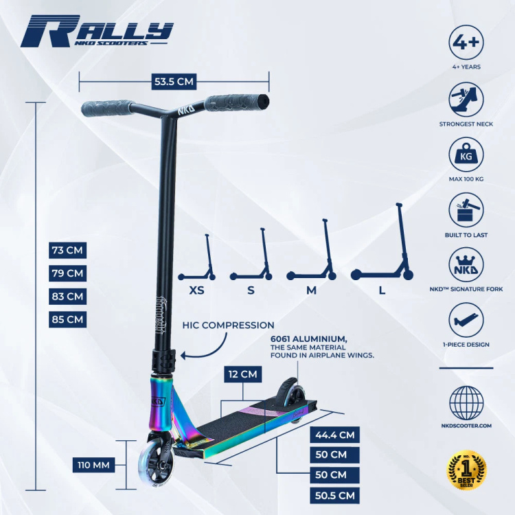 Cele mai înalte standarde de producție ale Rally V4 și materialele de cea mai bună calitate - o platformă cu șine ranforsate pentru șine din aluminiu de înaltă calitate , ghidon din oțel cromat, sistemul de compresie a furcii HIC care asigură lipsa jocului, durabilitate sporită și rotiri netede ale barei, rulmenți ABEC 9 de mare viteză, poliuretan de înaltă calitate cu duritate 88A și un miez din aluminiu din care sunt fabricate roțile - fac scuterul suficient de puternic pentru a crește siguranța și a vă permite să vă bucurați de achiziția dvs. pentru o lungă perioadă de timp.