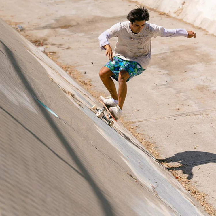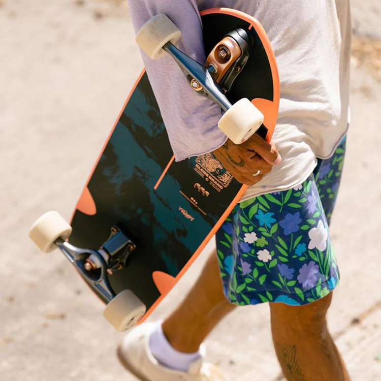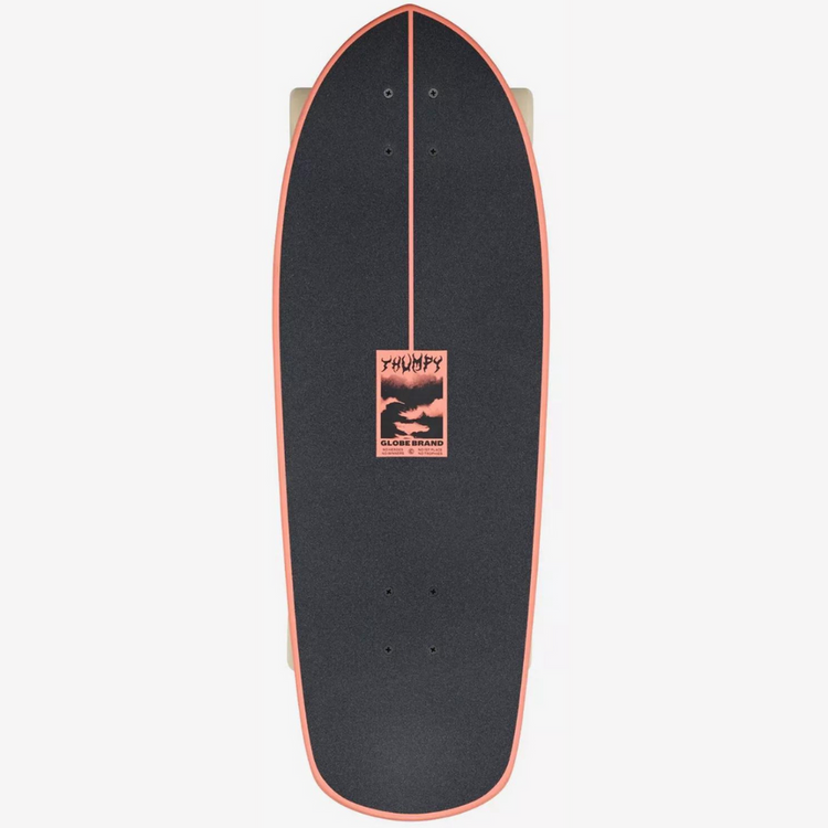 Aspectul Thumpy este un model nou creat folosind o metodă unică de imersie a vopselei. Partea superioară este acoperită cu un model albastru închis pe un fundal închis datorită metodei moderne de scufundare completă a modelului în vopsea, ceea ce duce la un design destul de subtil - după standardele skateboarding-ului - și plăcut din punct de vedere estetic. Banda adezivă de pe partea din spate a plăcii este punctată cu linii roz aprins, care contribuie la consolidarea stilului contrastant și original al Storm Cats. Camioanele și roțile nu ies în evidență din compoziția sa cromatică și arată elegant în culori metalice lucioase și nuanțe asemănătoare fildeșului.