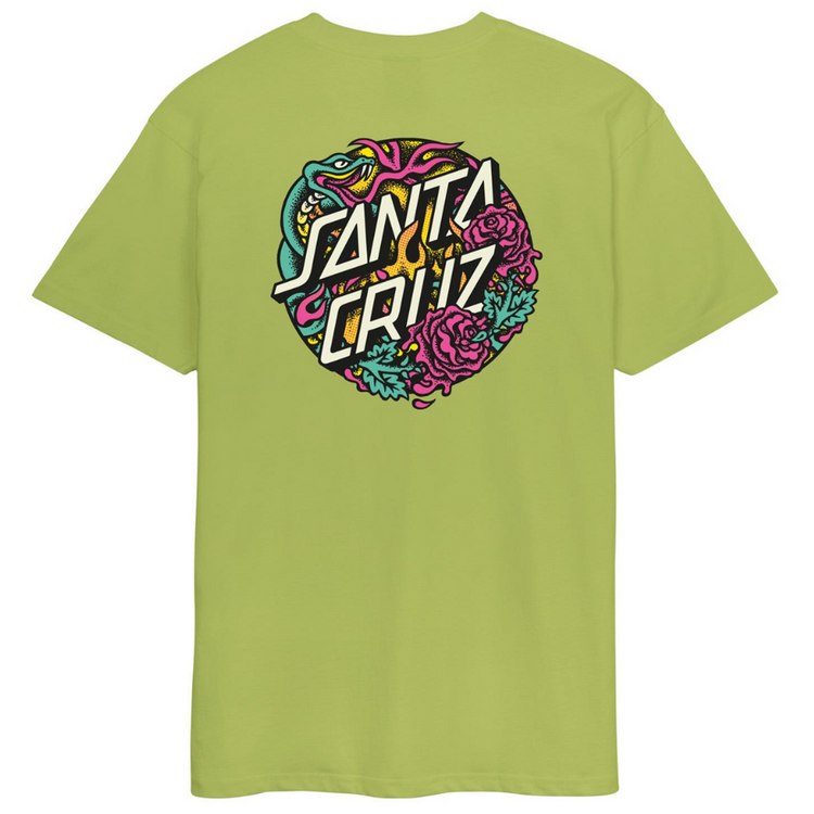 Tricoul are o versiune serpentină a logo-ului clasic Santa Cruz Dot imprimat pe pieptul din stânga și mai proeminent pe spate.
