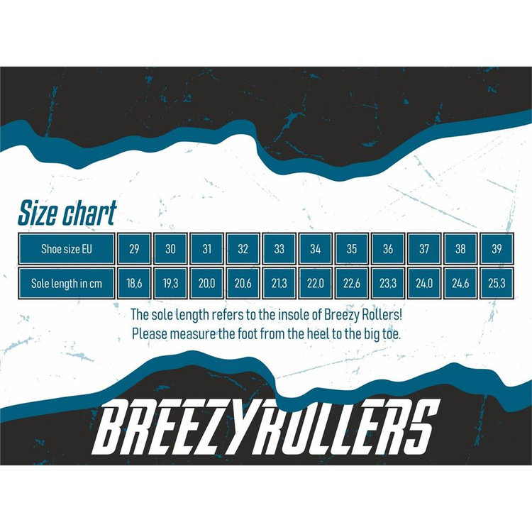 Pentru a a alege dimensiunea potrivită cu noile role Breezy Rollers măsurați lungimea piciorului - faceți acest lucru măsurând de la înălțimea călcâiului la înălțimea degetului mare. Apoi, la valoarea obținută se adaugă 2 cm - rezultatul obținut va fi dimensiunea potrivită a tălpii Brezzy Rollers pentru dumneavoastră. Verificați la ce mărime de încălțăminte corespunde dimensiunea tălpii interioare rezultate. Dacă rezultatul obținut variază între două mărimi de pantofi, optați întotdeauna pentru mărimea mai mare!