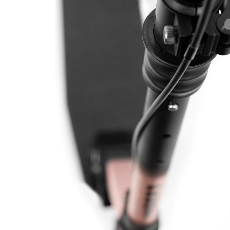 Frenzy Air Zero este echipat cu un ghidon în T reglabil și curbat, cu o lățime de 49 cm, cu un tub telescopic din aluminiu și o clemă anti-balansare. Mânerele confortabile vă vor oferi o călătorie confortabilă, iar mecanismul elegant de pliere cu cablu face ca plierea să fie rapidă și fără complicații. Greutatea acestui scuter este de numai 5380 de grame.