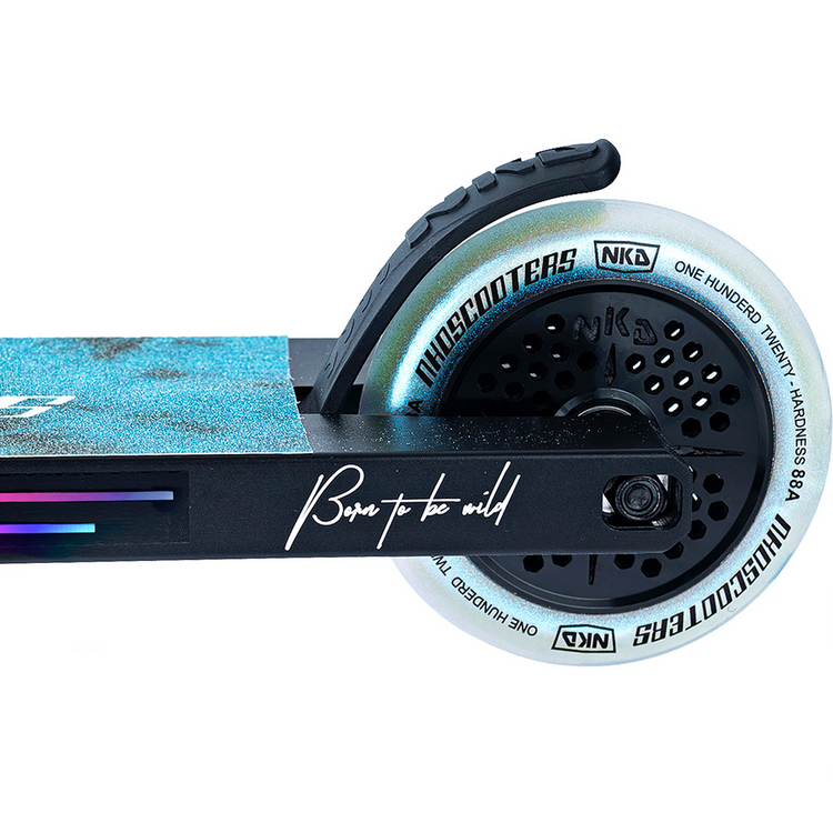 NKD Extreme utilizează o tehnică specială de schelet pentru a reduce greutatea componentelor individuale. Datorită procesării speciale a modelelor de piese 3D pregătite pe mașini CNC, piesele de scuter, cum ar fi puntea, furca, clema sau roțile, sunt realizate prin tăierea unei singure piese, fără a fi nevoie de sudură. Prin urmare, materialul în exces calculat în prealabil este eliminat, iar rezistența maximă a componentelor este menținută, reducându-se în același timp greutatea. În plus, decupajele scheletului dau scuterului un caracter și un design original. În plus, NKD Extreme utilizează o platformă de dimensiuni mai mari decât modelele de scutere de performanță de bază. Acesta crește confortul călătoriei și vă permite să efectuați trucuri pe cele mai mari obstacole. Cu roțile de 120 mm, puteți atinge viteze mai mari pe acest scuter și puteți efectua trucuri mai complexe cu încredere. Datorită dimensiunii lor, acestea vor permite, de asemenea, utilizarea NKD Extreme pentru condusul zilnic. Accesul confortabil la skatepark nu va mai fi o problemă pentru tine!