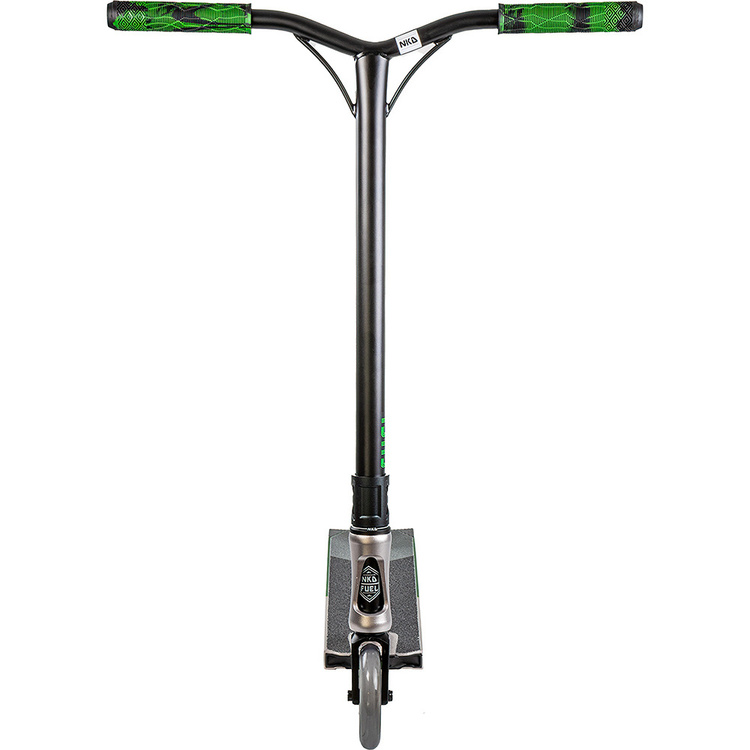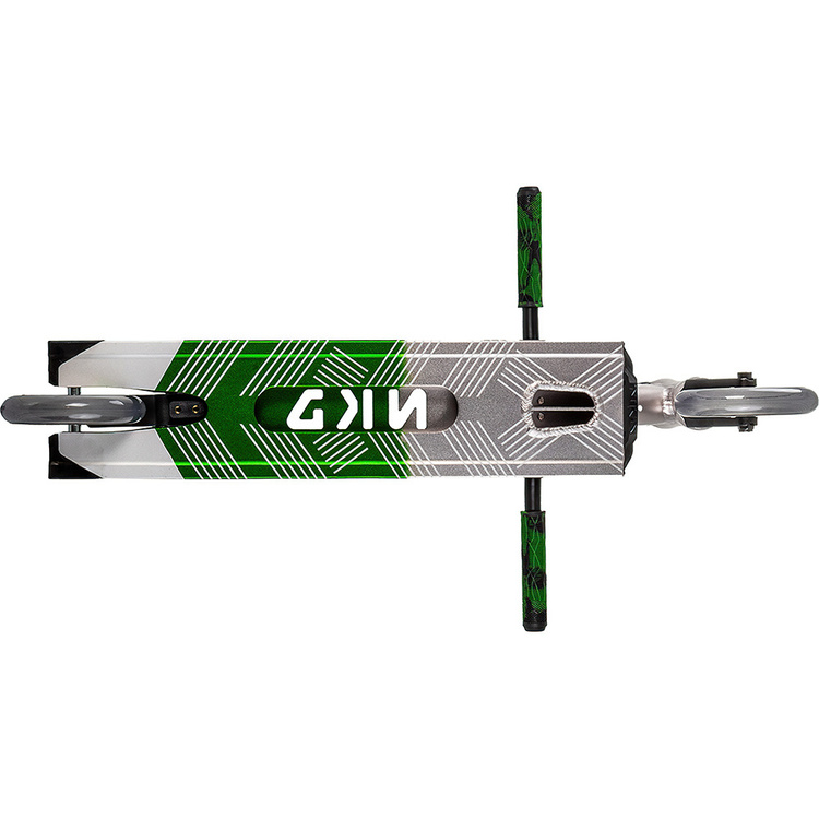 Caracteristicile sale unice includ o furcă ușoară NKD și roți mari cu diametrul de 120 mm, cu miez gol. Această suspensie este special concepută pentru CONDUCERE DURĂ! Utilizarea unei frâne din plastic prelungește și mai mult durata de viață a acestor roți moderne și reduce riscul de rănire atunci când piciorul apasă mai tare pe frână. Dropout-urile au fost tăiate din platformă în jurul grifonului, clemei și părții inferioare a platformei pentru a reduce greutatea și pentru a face scuterul mai confortabil de manipulat, în timpul evoluțiilor aeriene. Forma platformei astfel modificată facilitează alunecările și alunecările pe tuburi și balustrade. Din centrul platformei, logo-ul NKD gravat, cu un design cromat, ne privește.