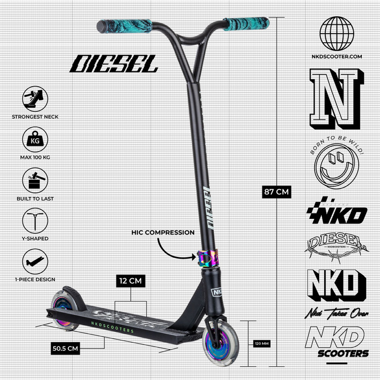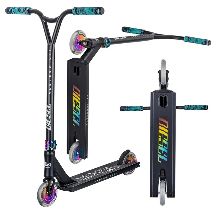 - NKD Diesel Stunt Scooter este un scuter de cascadorie proiectat atât pentru skatepark, cât și pentru uz stradal, cu componente de înaltă calitate, cu o durabilitate mare și o înălțime totală de 87 cm.