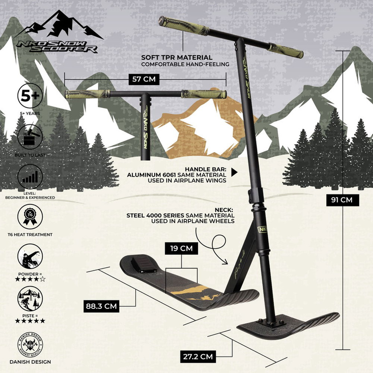 - Trotineta cascadorie NKD SNOW este o trotinetă cascadorie pentru călărit și efectuarea de trucuri pe zăpadă, concepută pentru copii și adolescenți începând cu vârsta de 5 ani și combină cele mai bune caracteristici ale unei trotinete cascadorii și ale unu