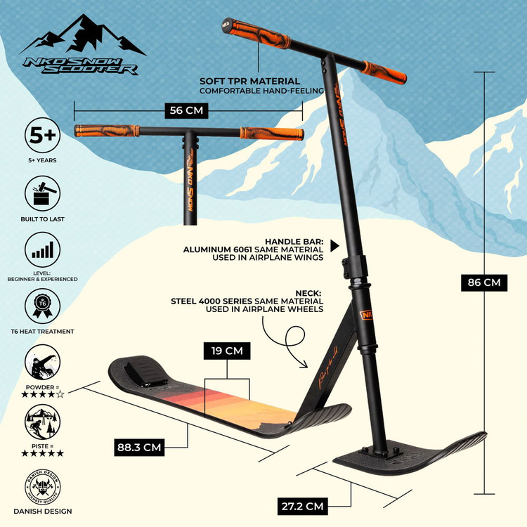- Trotineta cascadorie NKD SNOW este o trotinetă cascadorie pentru călărit și efectuarea de trucuri pe zăpadă, concepută pentru copii și adolescenți începând cu vârsta de 5 ani și combină cele mai bune caracteristici ale unei trotinete cascadorii și ale unu