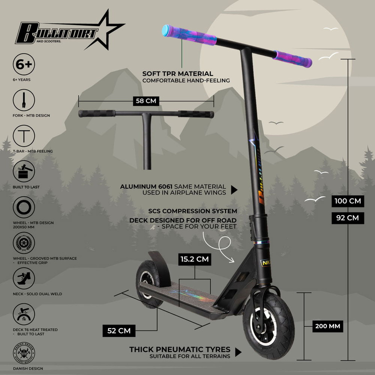 • NKD Bullit Dirt Scooter este un scuter de performanță off-road cu roți MTB mari, gonflabile, foarte durabile. Proiectat pentru a merge și a efectua trucuri pe aproape orice teren.