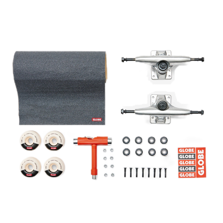 • Un kit complet de la Globe care include tot ce aveți nevoie pentru puntea dvs. de skateboard pentru a face un skateboard complet: truckies Slant, roți Globe G1 Street, rulmenți ABEC-7, un set de suporturi, griptape și Skate Tool.