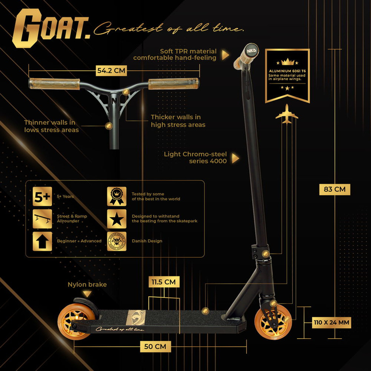 • NKD GOAT Stunt este o trotinetă excelentă, ușoară, pentru stradă și skatepark, cu componente de înaltă calitate cu o durabilitate mare. Este proiectat pentru performanță și durabilitate.
