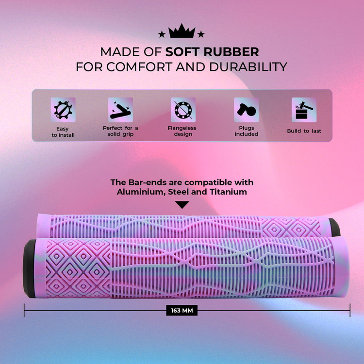 • Mânerele NKD GOAT sunt moi și confortabile, cu o lungime de 163 mm, care se prind bine chiar și atunci când se rulează dur. Se potrivesc majorității ghidonelor și sunt disponibile într-o gamă largă de culori, astfel încât să le puteți asorta cu ușurință s