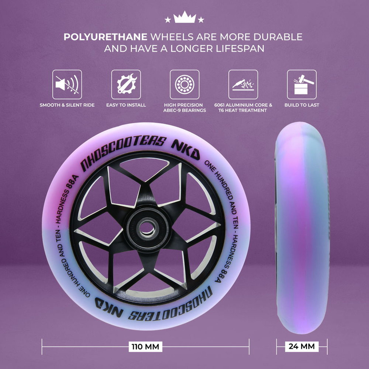 • Roțile NKD Goat cu diametrul de 110 mm sunt baza solidă a unei trotinete de performanță - miezul din aluminiu, rulmenții ABEC-9 și duritatea 88A oferă control maxim și stil. Precizia daneză și poliuretanul durabil fac din fiecare truc o plăcere.
