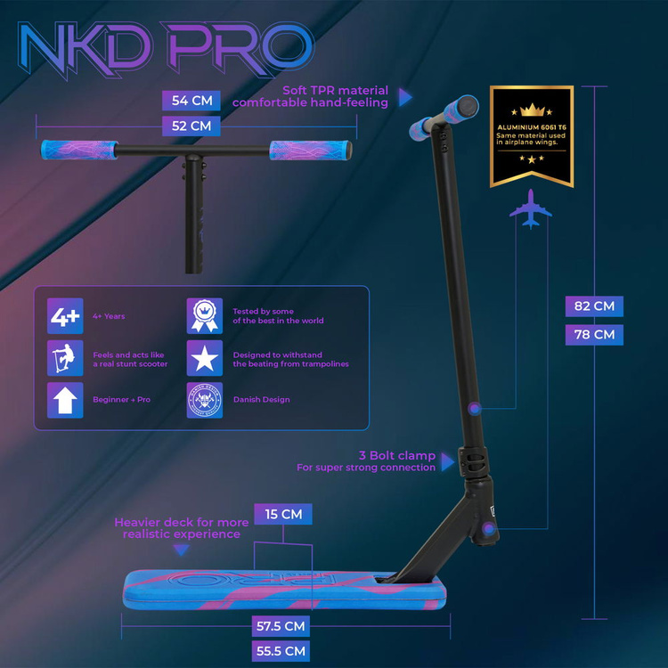 NKD a fost întotdeauna în fruntea inovației. Continuându-și moștenirea celor mai bine vândute trotinete, NKD a prezentat Pro Trampoline Stunt Scooter, o trotinetă de înaltă performanță cu trambulină proiectată cu atenție. Acest model este rezultatul combinării feedback-ului din partea unei comunități angajate cu cea mai recentă tehnologie pentru a oferi o experiență de neegalat a trucurilor cu trambulină scooter. Rezultatul este o combinație magistrală a celor mai bune caracteristici ale celebrei trotinete de trucuri și ale celor mai importante trotinete de trucuri cu trambulină de pe piață. Experimentați excelența de neegalat cu această inovație unică!