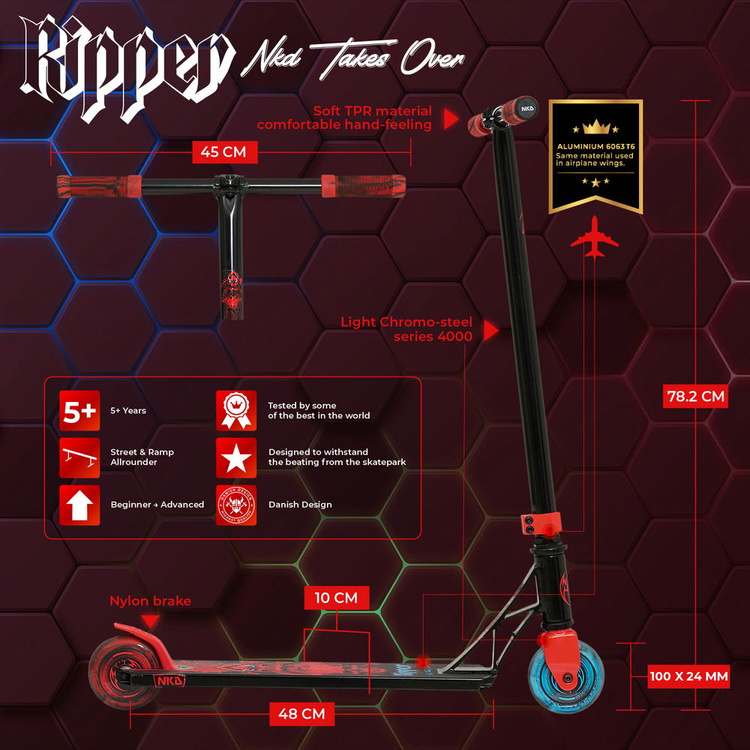 • NKD Ripper este o trotinetă de performanță extrem de ușoară și robustă - ideală pentru trucuri de skatepark și echitatie streeet. Oferă control deplin și stil în orice situație.