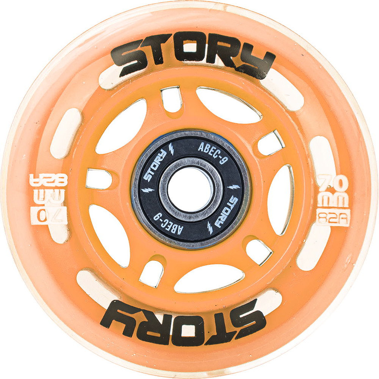 • Story Wheels sunt roți de skate ușoare, durabile și izbitoare cu duritate 82A, cu rulmenți ABEC-9 de mare viteză, proiectate în trei diametre diferite: 64mm, 70mm și 74mm. Disponibil în multe culori, de asemenea în versiuni luminescente. Set de 8 piese in