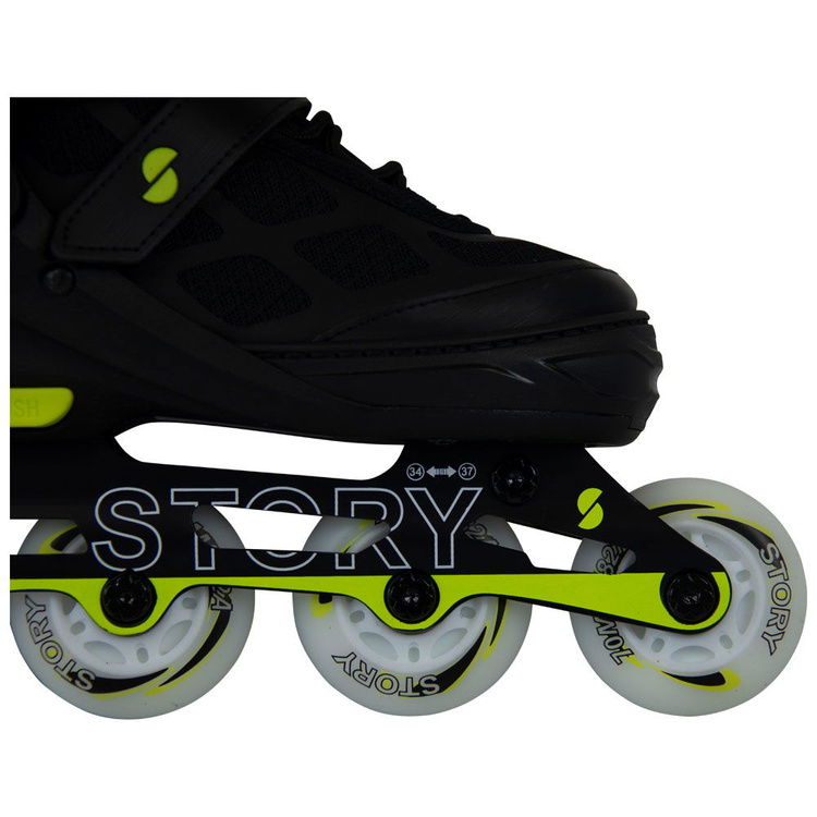 • Patinele cu role reglabile Story Midnight combină confortul, ușurința și designul modern pentru a oferi o plimbare stabilă și lină pentru copii și adulți deopotrivă. Versiunea cu roți strălucitoare oferă un plus de stil și distracție într-un climat urban.