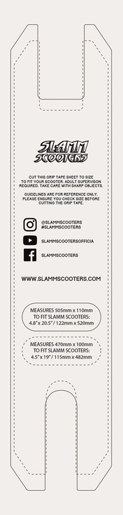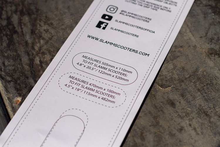 Griptape de la Slamm are linii de ghidare pe spate pentru a permite o potrivire precisă pentru modelele de scutere Slamm care măsoară 4,5" x 19" și 4,8" x 20,5".