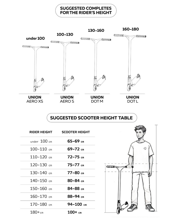 Cauți un echipament care să-ți permită să scoți maximum din fiecare trick? Union Aero este deja aici! Această trotinetă ușoară ca o pană cântărește doar 2,78 kg, ceea ce o face cea mai ușoară trotinetă freestyle produsă în serie din lume! O astfel de greutate nu este doar un rezultat impresionant – este un nivel complet nou de control al trick-urilor, manevrabilitate și fluiditate a mersului. Pentru riderul care tratează trotineta nu doar ca pe un echipament, ci ca pe o parte din stilul său de viață, este un adevărat game changer. Ușurința se traduce în oboseală redusă în timpul sesiunilor intense, mai multă precizie la trick-urile tehnice și libertate totală de acțiune. Ce este important – în ciuda construcției ultra-ușoare, Union Aero este incredibil de solidă și pregătită pentru orice obstacol întâlnit în jungla urbană. Trotineta Union Aero este produsă în trei mărimi: mărimea M cu înălțimea de 85 cm, mărimea S cu înălțimea de 80 cm și Aero XS cu înălțimea de 73 cm. Iar varianta ei mai mare este modelul Dot L cu înălțimea de 90 cm și M cu înălțimea de 85 cm.