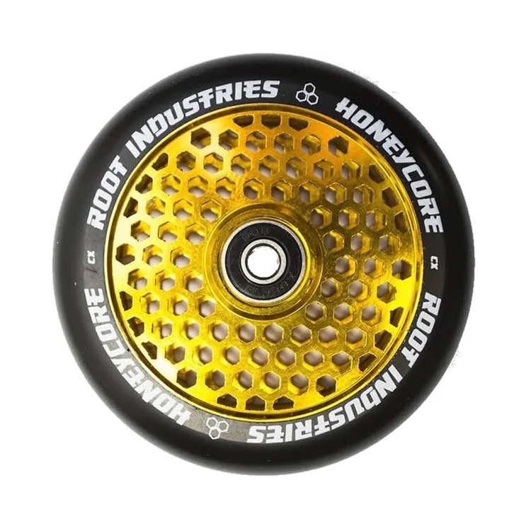 Honeycore este mai mult decât un set de roți - este o combinație de performanță de top și stil rafinat. Aceste modele sunt proiectate pentru durabilitate maximă, viteză mare și cea mai mică greutate posibilă, create pentru motocicliștii care doresc echipament fără compromisuri. Conducerea lină, accelerația rapidă și controlul complet vă permit să vă depășiți limitele și să vă folosiți la maximum abilitățile. Acestea sunt oficial cele mai ușoare roți de scuter cu diametrul de 120 mm de pe piață - o roată cu rulmenți cântărește doar 228 g (200 g fără rulmenți). Designul honeycore a fost testat în toate condițiile, dovedindu-și fiabilitatea atât în parc, cât și pe stradă. Aceste roți vă permit să inițiați trucuri mai ușor, să reacționați mai rapid și să călătoriți mai mult timp fără să obosiți. Miezul perforat din aluminiu 6061 reduce greutatea fără a compromite rigiditatea, în timp ce profilul rotund asigură o manevrabilitate previzibilă la viteze mari. Versiunea Honeycore de 120 mm oferă viteză maximă de rulare și efort ridicat - atât în parc, cât și pe stradă. Lățimea de 24 mm oferă o ghidare precisă, astfel încât roata rămâne previzibilă pentru aterizări și trucuri tehnice.