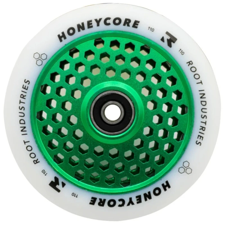 Honeycore este mai mult decât un set de roți - este un element care face o diferență reală la progres. Dacă scuterele sunt cea mai mare pasiune a ta și ești în căutarea unui echipament de performanță maximă, atunci acest model este făcut pentru tine. Oficial, acestea sunt unele dintre cele mai ușoare roți de pe piață - o roată cu rulmenți cântărește doar 203 g (170 g fără rulmenți). Îți permite să inițiezi trucuri mai ușor, să reacționezi mai rapid și să călărești mai mult fără să obosești. Miezul perforat din aluminiu 6061 reduce greutatea fără a compromite rigiditatea, în timp ce profilul rotund asigură o manevrabilitate previzibilă la viteze mari. Honeycore cu diametrul de 110 mm este standardul de aur al freestyle-ului - oferind rulare rapidă și stabilitate la viteze mari, atât în park, cât și pe stradă. Lățimea de 24 mm oferă manevrabilitate precisă și compatibilitate deplină cu punțile moderne, astfel încât roata rămâne previzibilă pentru aterizări și trucuri tehnice.