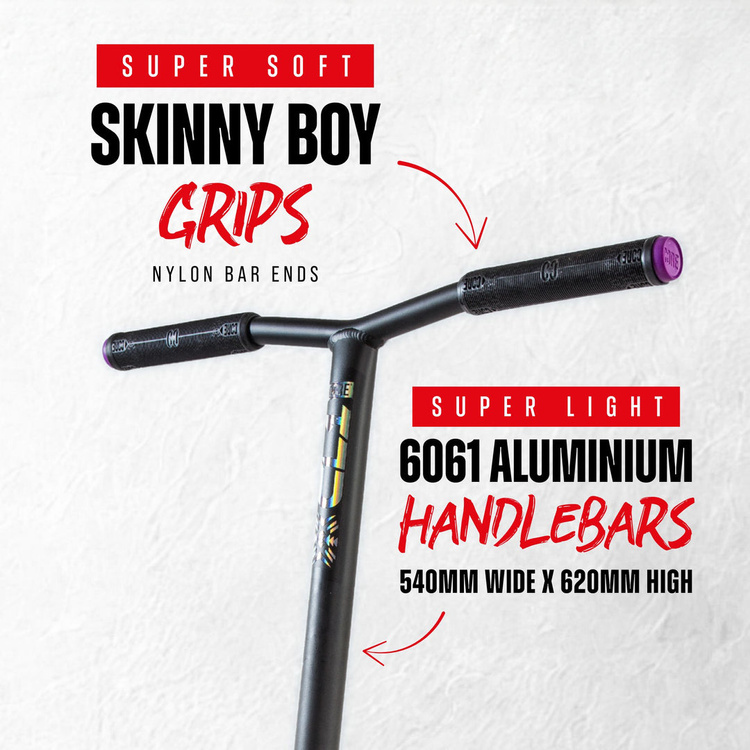 Trotineta este echipată cu grips Core Slim Grips de 170 mm lungime, care asigură un confort ridicat al mâinilor și o prindere sigură, create pentru antrenamente lungi și intense, unde controlul și confortul au o importanță reală în învățarea de noi trick-uri și legarea combo-urilor.