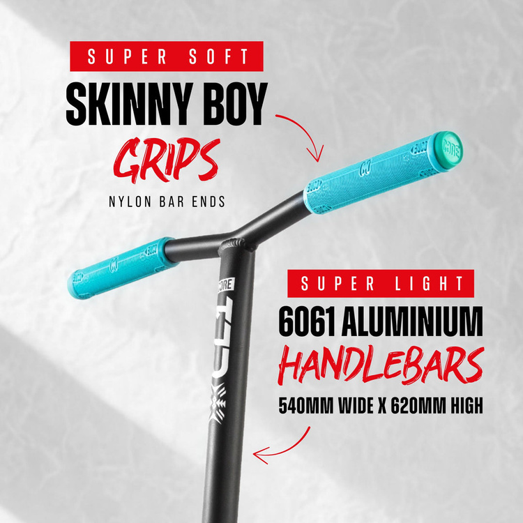 Trotineta este echipată cu grips Core Slim Grips de 170 mm lungime, care asigură un confort ridicat al mâinilor și o prindere sigură, create pentru antrenamente lungi și intense, unde controlul și confortul au o importanță reală în învățarea de noi trick-uri și legarea combo-urilor.
