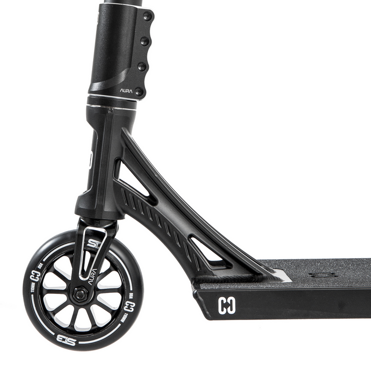 Geometria deckului cu concave de 3° și un unghi al headtube-ului de 83° a fost aleasă pentru ca trotineta să fie rapidă în reacții, dar previzibilă la aterizări. Furca CORE AURA HIC/SCS din aluminiu 7075 a fost proiectată pentru drop-uri mari și solicitări street intense, păstrând în același timp o greutate redusă. Totul este legat de compresia SCS, care oferă rigiditate maximă și precizie în control – soluția preferată de riderii experimentați și de cei care revin la mers la un nivel ridicat.