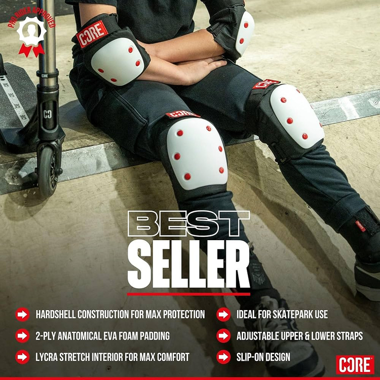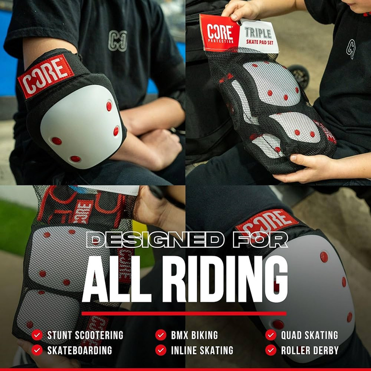 CORE Skate Triple Pad Set este un set complet de protecții conceput pentru riding intens în skatepark și pe spoturi de street, unde fiecare greșeală poate însemna o pauză de la riding. Într-un singur pachet primești protecții pentru genunchi, coate și încheieturi, potrivite atât pentru învățarea primelor trick-uri, cât și pentru sesiuni intense de street și skatepark. Este o soluție pentru skateri și rideri de orice nivel – atât pentru cei experimentați, care zboară pe cele mai înalte rampe și dau grind pe rail-uri masive, cât și pentru începători, care adună mii de căzături făcând primii pași în pasiunea lor. Confortul, fixarea sigură și protecția reală îți permit să te concentrezi pe progres și pe următoarele trick-uri, nu pe riscul de accidentare.