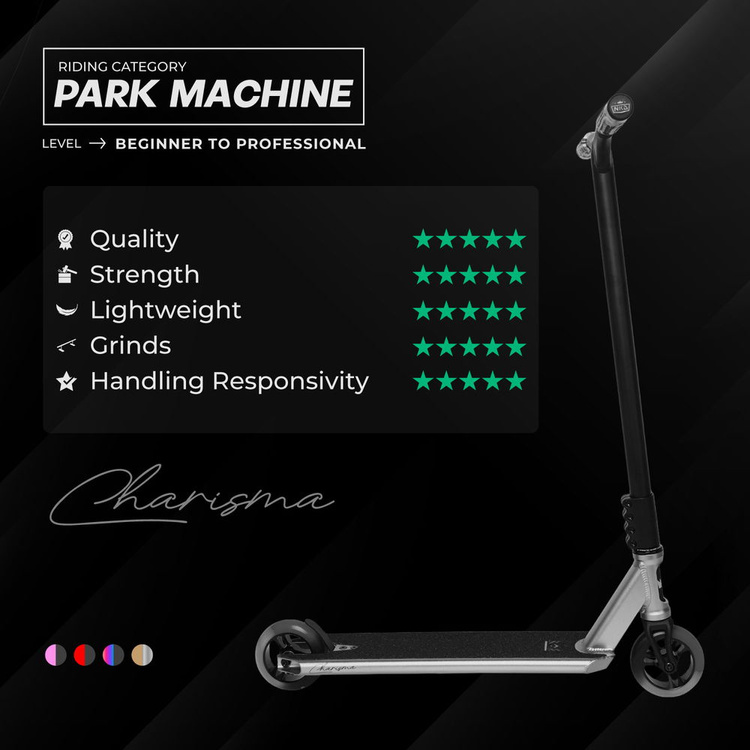 Scuterul de înaltă performanță NKD RIZZ "Charisma" este alegerea ideală pentru motociclistul care caută un echipament care combină performanța profesională cu atractivitatea stilului de viață. Datorită construcției sale extrem de ușoare și componentelor de calitate superioară, acest model oferă libertate maximă de mișcare, precizie și confort - fie pentru sesiuni intense la skatepark, fie pentru plimbări ocazionale prin oraș. Acesta a fost testat și aprobat de echipa NKD, garantând fiabilitatea și calitatea în care puteți avea încredere în fiecare zi. Detaliile rafinate, cum ar fi furca frezată, puntea sudată și subtăieturile pentru o durabilitate sporită înseamnă că fiecare element al acestui scuter are un scop. RIZZ "Charisma" nu numai că arată grozav, dar satisface și nevoile celor care doresc să se exprime prin mișcare, stil și dinamism. Alegeți un echipament care să țină pasul cu ritmul dvs.